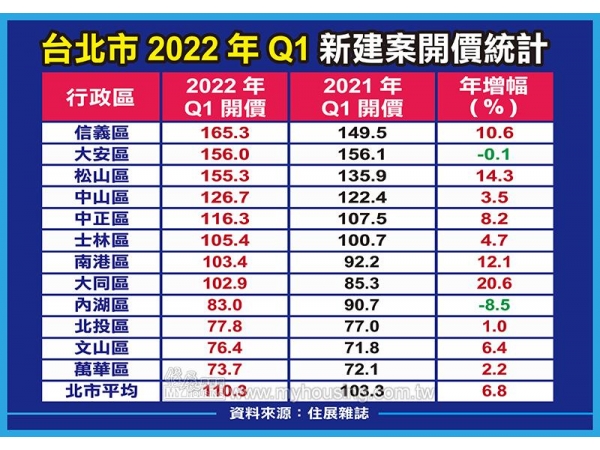 根據住展雜誌統計,大台北今年Q1新成屋、預售屋建案平均開價連袂創下歷史新高,其中台北市新建案Q1平均開價約每坪110.3萬元,比去年同期每坪增加約7萬、年增幅約6.8%;新北市今年Q1新成屋、預售屋平均每坪開價約50.6萬元,較去年同期成長約9.8%。